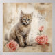 Um gato com rosas está sentado sobre um fundo castanho angustiado.