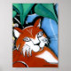 Esta pintura colorida de seda divertida de Sheryl Karas mostra um gato muito satisfeito sentado à sombra de uma planta cercada.