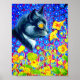 Poster com a pintura animal de Louis Wain Cat no Mar de Flores (1860-1939). Um gato preto e branco com olhos ouros cheira a flores amarelas. No fundo roxo estão flores azuis. Um presente maravilhoso para amantes de gatos e arte inglesa.