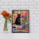 A vida de gato negro com um vaso de flores, fruta, livros sobre uma mesa de padrão misto, em estilo de matismo. Esta design foi feita com uma combinação de ai e photoshop.