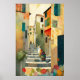 Este design vibrante retrata um gato colorido empoleirado ao lado de uma escada íngreme numa pequena vila mediterrânica. O estilo caprichoso captura a essência lúdica do gato, enquanto o uso de cores ousadas e vibrantes dá vida à cena da rua. Os tons quentes de laranja escuro e esmeralda clara evocam as cores das casas mediterrânicas, acrescentando ao encanto da peça. No geral, esse trabalho é um belo exemplo do poder da cor e da timidez em criar cenas de rua cativantes.