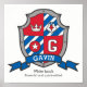 Estilo do Cavaleiro escudo monograma letra G nome de arte poster perfeito para um quarto de meninos ou sala de jogos em tons de vermelho, azul branco e cinza. Personalize com o nome e o nome do próprio filho, significando um toque verdadeiramente personalizado no quarto ou no berçário do seu filho, este exemplo é para o nome Gavin White hawk. Poderosa e rápida. Poster impressão ideal para um presente para um bebê novo, para batizar, nomear um bebê ou um presente de chá de fraldas. Desenho de escudo único, arte gráfica, investigação de nomes, redação e design por Sarah Trett. www.sarahtrett.com para www.mylittleeden.com