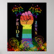 Gay LGBTQ Pride Month Love Wins Fist In Air Poster com cores e estrelas do arco-íris mostrando que o amor vence.