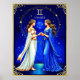 Poster em duas mulheres etéreas que representam o sinal de zodíaco Gemini. Vestidos com elegantes vestidos brancos e azuis, eles se espelham, segurando as mãos sob um céu noturno estrelado. O símbolo Gemini aparece acima deles evocando harmonia celestial e dualidade.