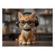 Esta peça de arte de feltro excepcionalmente charmosa e detalhada apresenta um adorável gato gengibre, meticulosamente cortado por agulhas de vários tons de laranja, gengibre e lã de creme para criar uma textura de pelo macia e lisa. O gato tem olhos verdes ou aveludados expressivos — cortados por agulhas ou acentuados com pequenas miçangas de vidro — junto com um nariz rosa minúsculo e bigodes brancos delicados. Ele veste um hélice preto humorístico, de tamanho excessivo, criado a partir de lã densa, completo com fones de ouvido integrados feltrados por agulhas pretas. Óculos redondos, de formato preto, descansam sobre o nariz, e uma simples coleira preta adiciona ao seu encanto brincalhão. Sentada em pé sobre uma superfície de madeira amarrada em agulha castanha escura, a cena é colocada sobre um fundo suavemente turvo, semelhante a uma oficina ou interior de escritórios acolhedores. O olhar geral é carinhoso, humorístico, e mostra detalhes texturais incríveis e artesanato na arte do feltro.
