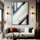 Transforme seu espaço com esta arte abstrata arquitetônica. Linhas diagonais em branco, cinza e azul-marinho criam uma composição limpa e moderna. Ideal para decoração corporativa e ambientes minimalistas. Design que transmite ordem e sofisticação visual.