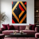 Abstração geométrica energética! Ouros e triângulos em preto, ouro, e vermelho intenso, com texturas aumentando a profundidade. Uma explosão visual misturando rigor matemático e paixão cromática — ideal para amantes modernos de arte que buscam contrastes ousados.