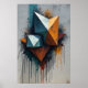 The clean lines of the polygons are dramatically contrasted by an explosion of vibrant paint splatters and expressive drips that cascade down the canvas. Hues of deep teal, rich orange, energetic yellow, and a striking touch of crimson bleed down the surface, mimicking the spontaneous and rebellious nature of street art found on forgotten city walls. Darker smudges and chaotic brushstrokes behind the main forms add depth and a gritty, industrial feel.