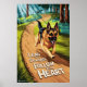 Um German shepherd corre por um caminho de inércia através de uma floresta, com a luz do sol fluindo pelas árvores. O cachorro está em estria de médio, com a língua para fora e um olhar determinado em seu rosto. O caminho é percorrido por relva verde e flores silvestres, e o ar está cheio dos sons da natureza. A citação inspiradora "Chumbo" com Força, "Seguir com Coração" é escrita através do caminho.