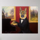 Este design apresenta um German shepherd elegantemente vestido com um casaco de rocha preta, camisa branca, perto do piano, contra uma parede vermelha com pinturas em quadros de ouro.