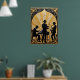 Esta pintura de ornamentado mostra um trio de jazz silenciado em preto profundo contra um pano de fundo de ouro com uma textura lavrada. Uma figura feminina central toca trompete, posicionada entre três músicos machos, um com trompete e outro com saxofone. Por detrás deles está visível uma sugestão de um kit de tambor. O fundo de ouro é rico em turbilhões, padrões emboscados e uma lua proeminente e estilizada, criando uma estética de jazz sofisticada e vintage que lembra o Art Nouveau ou as antigas Deco.