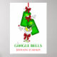 Bebida gêmea, cartão festivo de Natal de garrafas de gin verde penduradas penduradas e copo-medida acima da frase Gingle Bells. Há texto editável abaixo para você adicionar seus próprios nomes ou mensagens