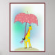 girafa bonita com um grande guarda-chuva rosa estrelado em um fundo pastoso azul