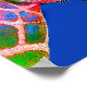 Um poster de uma girafa colorida segurando um girassol florado na boca contra um fundo azul brilhante. Uma imagem que coloca qualquer um de bom humor.