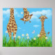 Girafas bonitas na grama verde e margaridas no céu azul com nuvens brancas.