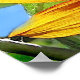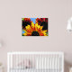 Este poster trará brilho e alegria à sua parede! Três girassóis brilhantemente coloridos são iluminados pela luz solar que flui através das pétalas. As flores exibem uma bela paleta de ouro, amarelo, laranja, vermelho e marrom. Folhas verdes e céu azul completam essa composição de cor e forma.