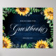 Casamento rústico country elegante e moderno, por favor, assine nosso pôster de livro de visitas com características de flores de girassol amarelo brilhante e moldura floral de baby's breath / gipsófila com folhas em fundo de madeira de celeiro azul marinho. Por favor, encontre mais designs e variações correspondentes na minha loja "blissweddingpaperie". E sinta-se à vontade para entrar em contato comigo para personalização adicional ou itens correspondentes.