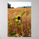 Um único girassol se destaca contra um campo dourado de trigo sob um céu claro. O sol ilumina a cena, criando um contraste entre o verde vibrante e o amarelo do girassol e os tons quentes do trigo maduro.