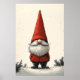 Uma ilustração encantadora de um gnomo festivo vestido com um chapéu e casaco vibrante vermelho, parado numa paisagem serena de neve. A barba branca longa do gnomo e o nariz branco espiam por baixo do chapéu alto e pontiagudo, evocando uma sensação de alegria de férias e folclore nórdico.