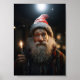 Foto de um magnífico gnomo de Natal surpreso na lente da câmera segurando uma vela