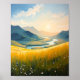 A peaceful landscape painting featuring golden fields, soft wildflowers, and a winding river that leads into distant sunlit mountains. The warm evening light and gentle colors evoke a sense of calm and connection with nature. Perfect as wall art for bedrooms, living rooms, or any space that embraces serenity and the beauty of open landscapes.