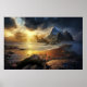 A stunning landscape where the sea meets majestic mountains under a dramatic sky. Golden sunlight breaks through clouds, illuminating sand and rocks. Ideal for bringing calm and grandeur to any space. Digital art capturing nature's raw and serene beauty with perfection.