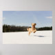 O entusiasmado rabisco de ouro corre alegremente através de um campo de neve fresca no final do inverno.