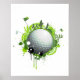 Ilustração moderna com golfe como tema. Uma bola de golfe representa a Terra com golfistas e bandeiras ao seu redor em tons de verde. Diversão e design moderna para o amante do golfe.