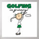 Uma figura de palito fêmea dourada com boate e texto que diz "Golfing is Groovy" em T-shirts de golfe, capuzes, canecas, cartões, autocolantes, mousépias, chaveiros, garrafas de água e muito mais.