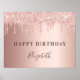 Para uma festa de aniversário giro e glamourosa. Um fundo metálico rosa dourado com pingos de brilho, pintura pingando. Personalize e adicione um nome. O nome é escrito com um moderno estilo escrito à mão. Texto: Parabéns