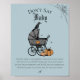 Este jogo de Chá de fraldas de Halloween chama-se "Don't Say Baby". A design: Retirada à mão a tinta preta, esta placa apresenta uma carruagem vitoriana para bebês, corvo preto, teias de aranha e uma abóbora, tudo contra um elegante fundo azul francês. Como jogar: Coloque este sinal junto com muitas teclas ao lado dele (pelo menos uma espinha de tecido por convidado). Quando o jogo começa, todos não podem dizer "bebê". Se você ouvir alguém dizer bebê, então você pode tirar a espinha de roupa dele. A pessoa com mais espinhos ganha.