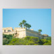 Experience the rugged beauty and historic grandeur of Malta’s sister island with this stunning photograph of Gozo’s ancient limestone fortifications. The image captures the striking contrast between the weathered, honey-colored stone walls and the vibrant green of palm trees reaching toward a crisp, cloudless sky.