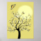 A graceful tree with dark, elegant branches sways against a yellow backdrop. Delicate blooms adorn its limbs, while soft yellow butterflies flutter around, adding a serene touch of movement and lightness to the composition.