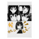 Esta imagem é uma banda desenhada ao estilo manga preto-e-branco, com quatro personagens femininas. Cada caractere está em um painel separado, com bolhas de pensamento e bolhas de fala contendo texto japonês. O primeiro personagem tem cabelos longos, heteros e pretos e está chorando. A segunda personagem tem cabelos longos, heteros e pretos e parece surpreendida com sua boca aberta. A terceira personagem tem cabelos hetero e preto longos e parece chocada com a boca aberta. A quarta personagem tem cabelos hetero e pretos curtos, olhando para frente com sua boca ligeiramente aberta, e tem um raio e bolhas de fala com texto japonês atrás dela. A imagem é desenhada num estilo simples, com linhas em negrito e detalhes claros. O tom geral da imagem é intenso e dramático.