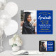 Adicione um toque personalizado a uma comemoração de faculdade ou segundo grau com uma foto personalizada azul real e poster de ouro 18"x24". A imagem e todos os textos neste modelo de sinal baixável são simples de personalizar, e as cores podem ser alteradas com a ferramenta Zazzle design. O design apresenta um boné de conselho de argamassa, uma elegante tipografia clássica, uma caligrafia na moda moderna e uma fotografia do formando, como uma fotografia de mais velho ou imagem da cerimônia de início. Observe que o ouro é amarelo impresso, não é folha metálica. Este poster de formatura imprimível é uma maneira elegante de dar boas vindas a amigos e familiares para uma celebração especial. Parabéns ao formando!