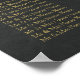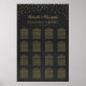 Gráfico de assentos de casamento para dezesseis mesas com fundo preto impresso e texto dourado e confete, e fontes elegantes. Nota: as cores douradas são efeitos impressos e não folhas de ouro reais.