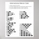 Morse code é um método de transmissão de informações textuais como uma série de tons, luzes ou cliques ligados, que podem ser entendidos diretamente por um ouvinte ou observador qualificado sem equipamento especial. O Código Internacional Morse codifica o alfabeto romano, os algarismos árabes e um pequeno conjunto de sinais de pontuação e de procedimento como sequências padronizadas de sinais curtos e longos chamados, respectivamente, de "pontos" e "traços", ou "dits" e "dhs". Como muitas línguas naturais não-inglesas usam mais do que as 26 letras romanas, existem extensões ao alfabeto Morse para essas línguas. Os direitos de reprodução de imagem podem ser encontrados no link próximo à parte inferior desta descrição. Inscreva-se no Sr. Rebates para GRATUITA e salve 12% em qualquer ordem zazzle além de um bônus de inscrição de US$ 5,00 Todos os Direitos Reservados; sem: preconceito, recurso ou aviso (U.C.1-308) Direitos de reprodução de imagem: http://commons.wikimedia.org/wiki/File:International_Morse_Code.svg "morse code" morsecode diagrama gráfico "morse code gráfico" "morse code diagrama" código" "letras de código mais" "números de código mais graves"