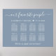 Gráfico de assentos azuis empoeirados para download de chic para até 8 mesas com "nossas pessoas favoritas" em um roteiro elegante com baloiços, seus nomes e data de casamento juntos com um coração e "Estamos tão felizes que você está aqui" em tipografia serif branca clássica. Você pode selecionar a opção de download digital a ser editada com alterações de última hora e impressão localmente.