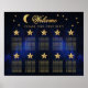 Um gráfico de assentos de casamento de 10 mesas para um tema de casamento celestial, com a lua e a estrela em um fundo azul de noite estrelada. Os números das mesas são escritos em grandes estrelas douradas. A lua, as estrelas e são douradas. A palavra Bem-vindo é escrita em uma fonte caligráfica elegante.
