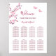 A cereja branca floresce e duas borboletas bonitinhas num fundo branco. Sinal de boas-vindas de casamento com noiva personalizada e nomes de noivos em um roteiro elegante e manuscrito e uma lista de assentos para 80 nomes de convidados. Para o seu casamento de primavera ou de verão. Produtos de casamento correspondentes disponíveis.