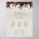 Este gráfico de assentos de casamento tem 5 mesas. O fundo é de mármore branco. Na borda superior, há peônias vermelhas burgundy e brancas. Os nomes dos noivos e o título Bem-vindos são escritos em uma fonte caligráfica elegante. Todo o texto tem uma cor dourada.