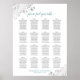 Este lindo gráfico de assentos de casamento inclui atribuições de mesa para 160 convidados, com 10 pessoas em cada mesa. O design é simples, mas elegante, com texto cinza escuro e azul turquesa ou turquesa em um fundo branco e apresenta filigrama prateado falso rendado nos cantos com caligrafia cursiva sofisticada que diz "por favor, encontre sua mesa". Sofisticado e chique.