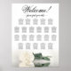 Eleve a elegância e a sofisticação da sua recepção de casamento com este impressionante quadro de 22 mesas. O design floral moderno apresenta um marfim marcante, branco ou rosa colorido creme que repousa na horizontal, refletindo elegantemente numa piscina serena de água. O gráfico acomoda até 220 convidados com um layout clássico de 10 lugares por mesa. O título é escrito em na moda caligrafia, acolhendo seus convidados e guiando-os até seus assentos. A seção inferior oferece amplo espaço para os nomes dos casais e a data do casamento, adicionando um toque pessoal à sua decoração. Este assento exude romance, graça e glamour, e é a maneira perfeita de garantir um assento suave e na moda para seus convidados.
