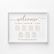 Elegante placa de poster de assentos de casamento baixável para 7 mesas que apresenta "bem-vindos" em um roteiro de ouro com baloiços, seus nomes e data de casamento juntos por um coração de ouro e "Estamos tão felizes que você está aqui" em uma simples tipografia de ouro moderna. Este poster pode ser baixado e impresso localmente para alterações de última hora.