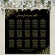 Este gráfico de assentos de casamento inclui atribuições de mesa para 150 convidados em 15 mesas. O design é simples, mas elegante, com texto dourado sobre fundo preto. O título está escrito em uma caligrafia de escrita falada e há decorações florais frias de folha falsa nos cantos. Na moda, chic e sofisticada maneira de ajudar seus convidados a encontrar seus assentos na sua recepção.