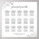 Este gráfico de assentos de casamento inclui atribuições de mesa para 150 convidados em 15 mesas. O design é simples, mas elegante, com texto de cinza escura sobre fundo branco. O título está escrito em uma caligrafia de escrita falada e há decorações florais frias de folha de prata nos cantos. Na moda, chic e sofisticada maneira de ajudar seus convidados a encontrar seus assentos na sua recepção.