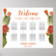 Um gráfico de assentos floral com 8 mesas para um casamento com tema de cacto / festa. Há flores de cacto vermelhas nas bordas esquerda e direita. A palavra Bem-vindo na parte superior é escrita em uma fonte manuscrita sofisticada laranja-vermelhada, a mensagem "Por favor, encontre seu lugar!", os nomes e a data do casamento em letras manuscritas da mesma cor laranja-vermelhada semelhante às flores de cacto, o restante em letras maiúsculas pretas pequenas. O fundo é branco.