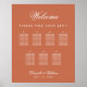 Um gráfico de assentos de casamento simples com 7 mesas. O fundo é terracota (marrom), o texto é branco. A palavra Bem-vindo na parte superior e os nomes da noiva e do noivo são escritos em uma fonte caligráfica elegante, o restante em maiúsculas.