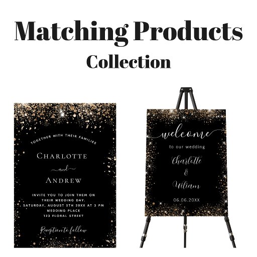 Um clássico fundo negro. Decorado com corações ouros. Personalize e adicione o nome da noiva e do noivo, adicione os nomes dos convidados. Texto branco.