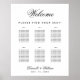 Um gráfico de assentos simples em preto e branco com 6 mesas. O fundo é branco, o texto é preto. A palavra Bem-vindo na parte superior e os nomes são escritos em uma fonte caligráfica elegante, o resto em maiúsculas.